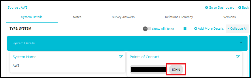 To view all fields of the selected system (e.g., AWS), click the dropdown arrow at the right-hand corner of each category or simply click anywhere on the category itself after the arrows.