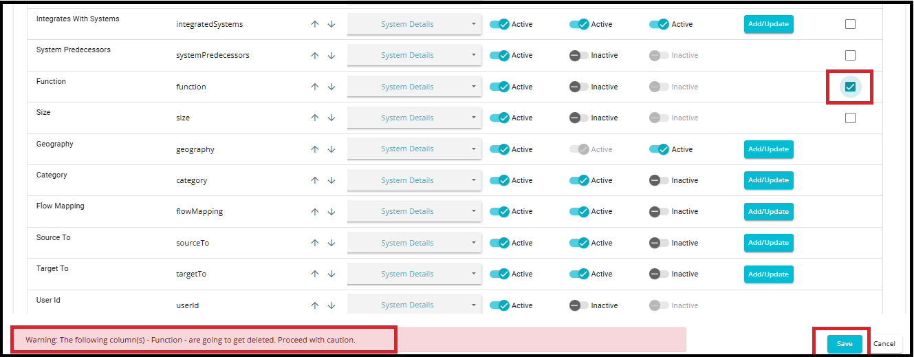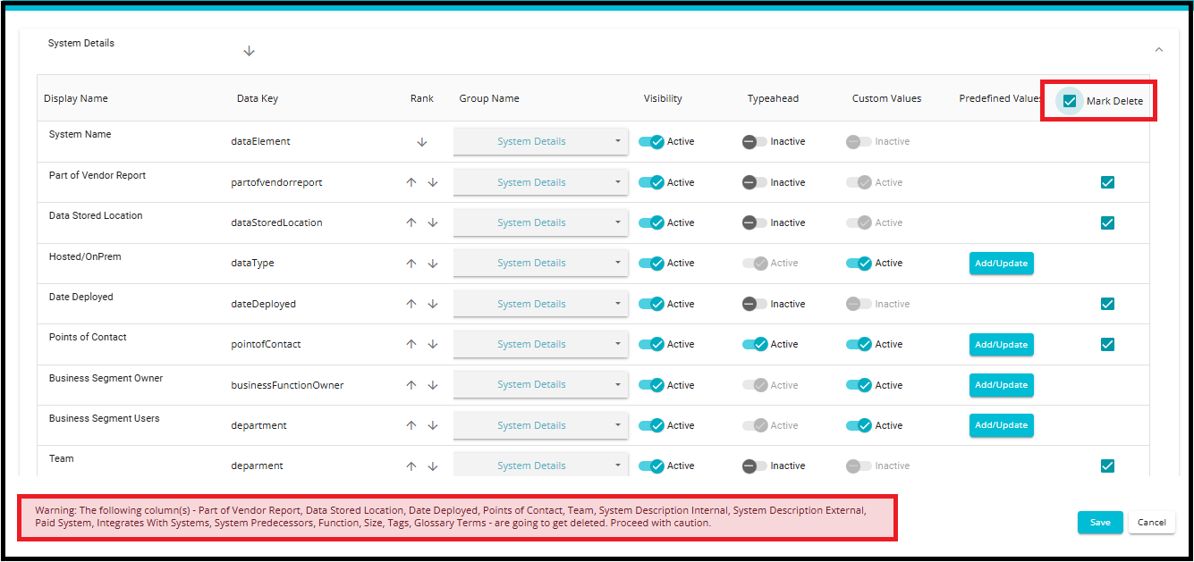 A warning message will appear at the bottom of the page, listing all the columns that are about to be deleted (e.g., Function, Data Stored Location, Points of Contact, etc.).