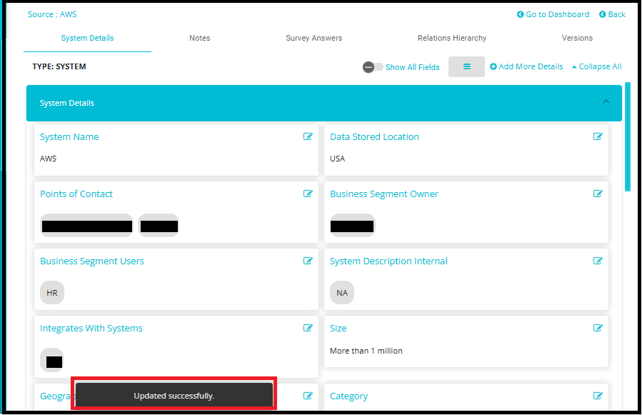 - After successful deletion, you will be navigated back to the System Details page, where a confirmation message "Updated successfully" will appear, indicating that the selected metadata columns have been deleted.