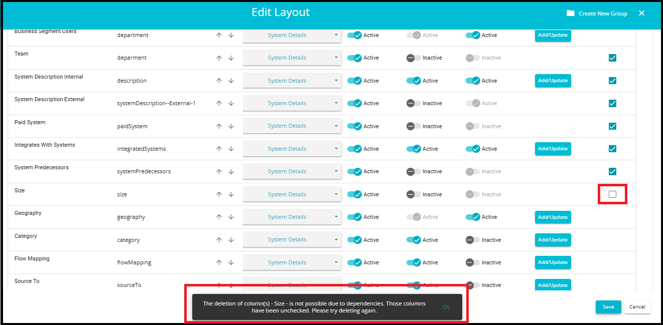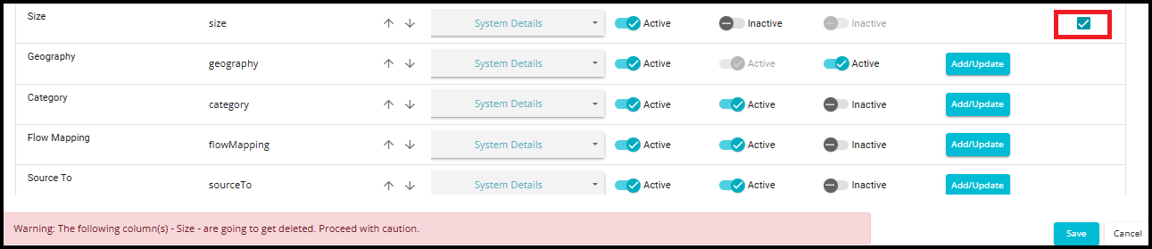 For example, a column like "Size" might be referenced in a survey question or used in a report filter. If such dependencies exist, the system will automatically uncheck these columns during deletion attempts to prevent breaking cross-module references.